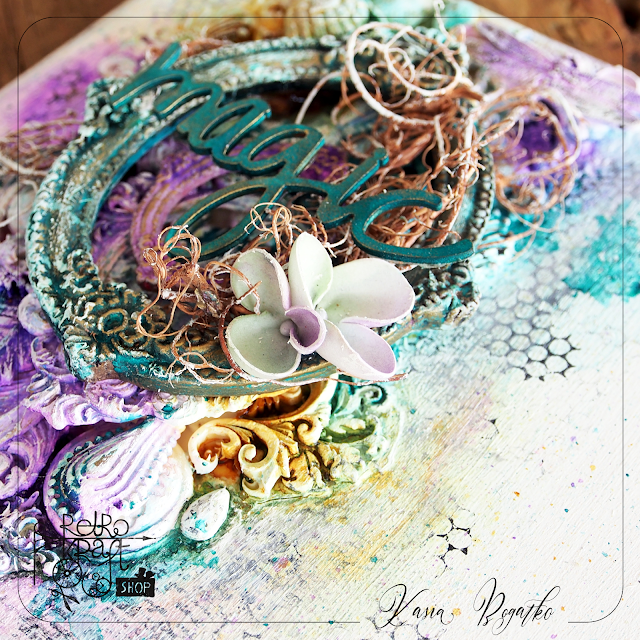This project was created some time ago. In fact, the base for this project. I put a lot of resin castings on the wood, I painted with gesso and gently colored with watercolors. And that's it. I couldn't finish it. However, when alcohol inks came into my hands, I decided to give it a second chance. Thanks to these strong, saturated colors, the whole project took on a new life.